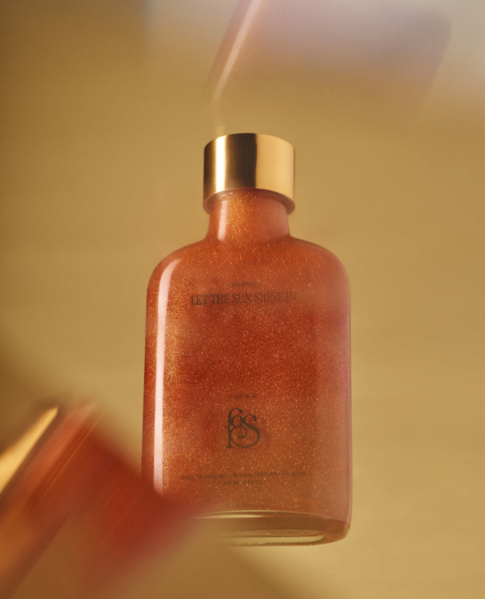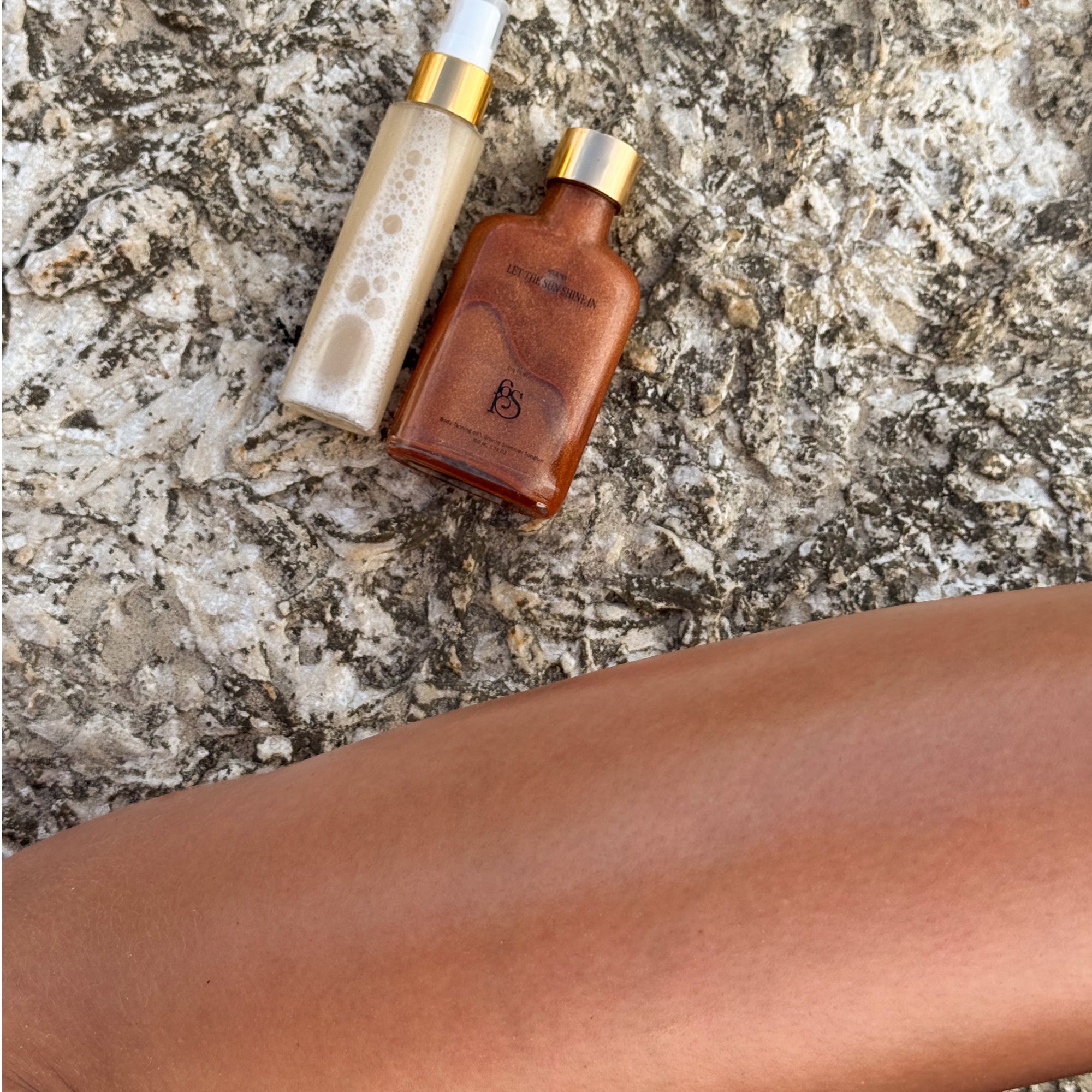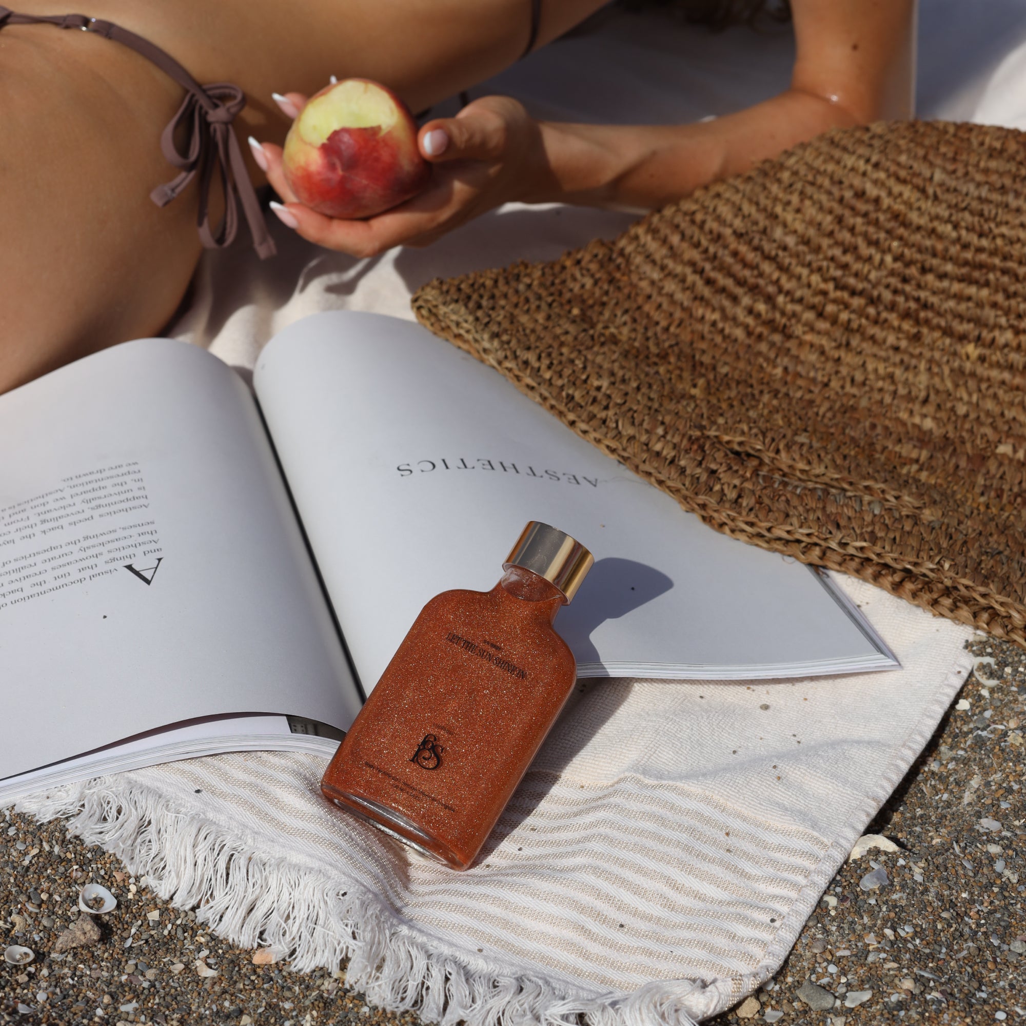 שמן שיזוף משי עם ברק ברונזה וזוהר מיידי שנראה כמו חופשה.